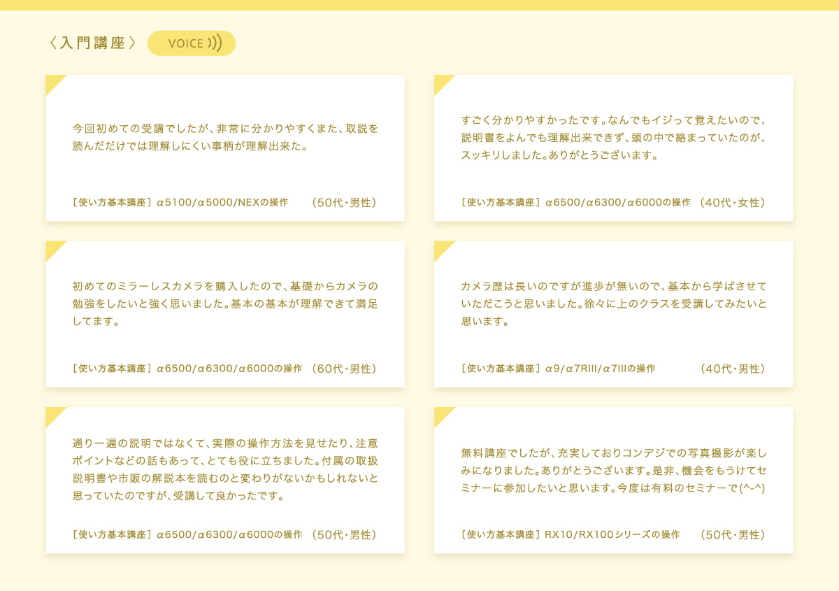 ソニーのデジタル一眼カメラαの基本操作を学ぶ無料の使い方講座から、プロフォトグラファーが同行する風景・スナップ・ポートレートなど被写体別の撮影実践講座まで、αをお使いの方々のレベルに応じた講座を多数用意します。