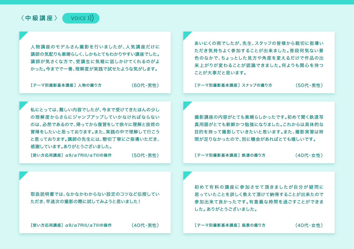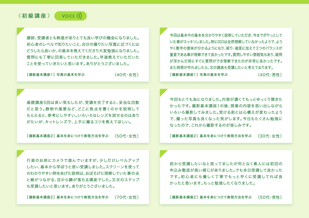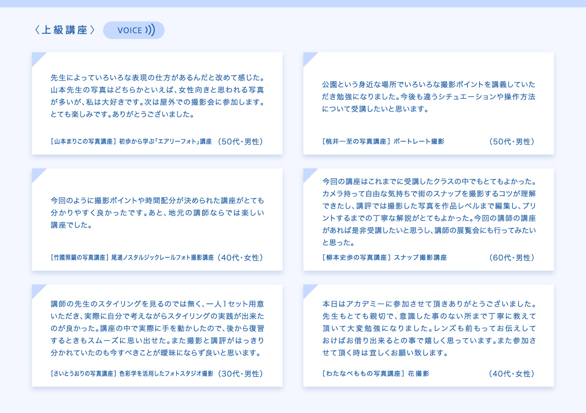 初めて一眼カメラを手に取った方から、プロを目指して活動している方まで、幅広い層の方の撮影技術の向上と創作活動を支援します。