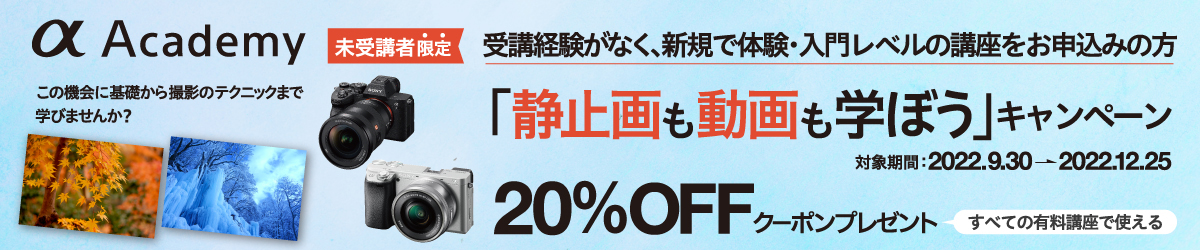 | キャンペーン内容 | αアカデミー講座を初めて申し込まれたかたで体験・入門レベルの無料講座を期間中に申込されますとαアカデミー有料講座で使用できる20%OFFクーポンをプレゼントします |